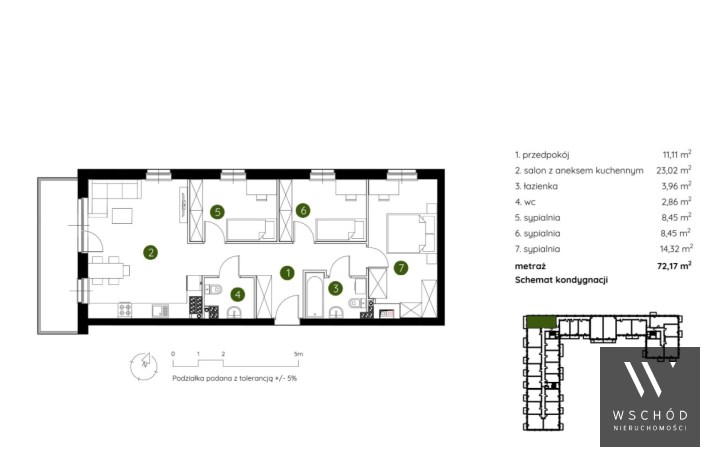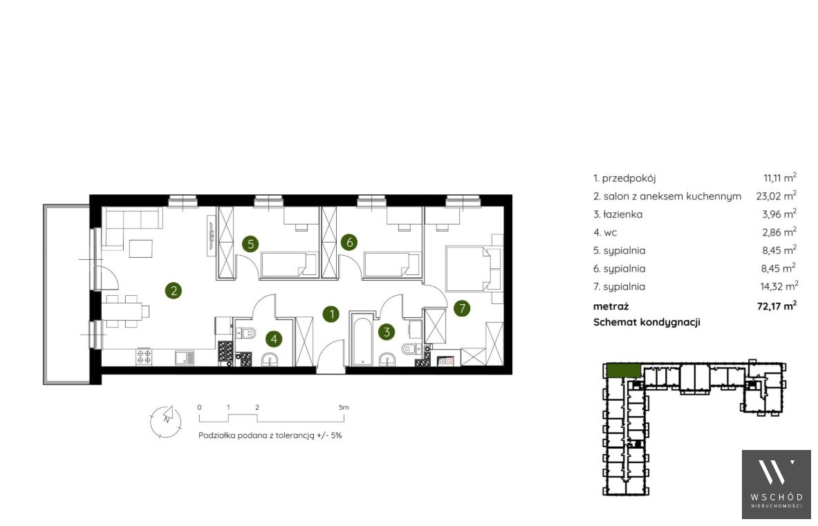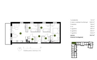 Mieszkanie składające się z salonu z aneksem kuchennym , trzech sypialni, dwóch łazienek, przedpokoju, oraz balkonu