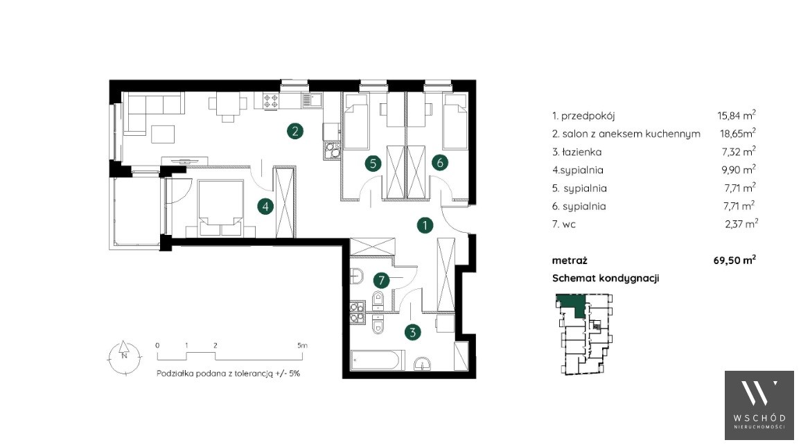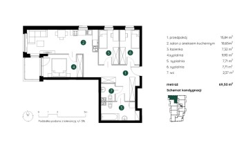 Mieszkanie składające się z salonu  z aneksem kuchennym , trzech sypialni, łazienki , WC oraz balkonu.