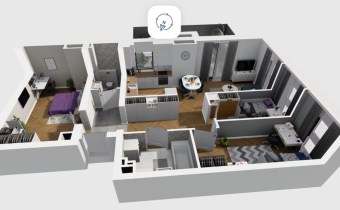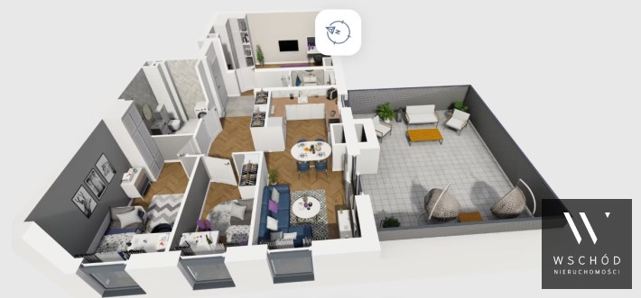 Mieszkanie składające się z salonu z aneksem kuchennym, trzech sypialni, przedpokoju, garderoby,  łazienki, WC  oraz przestronnego  tarasu.