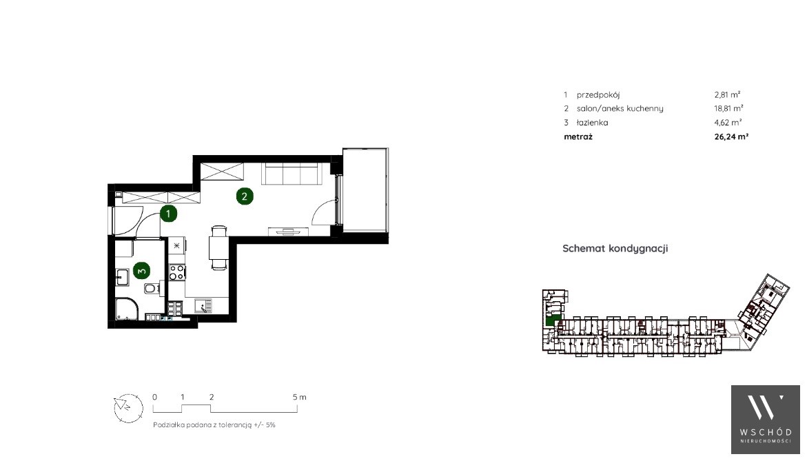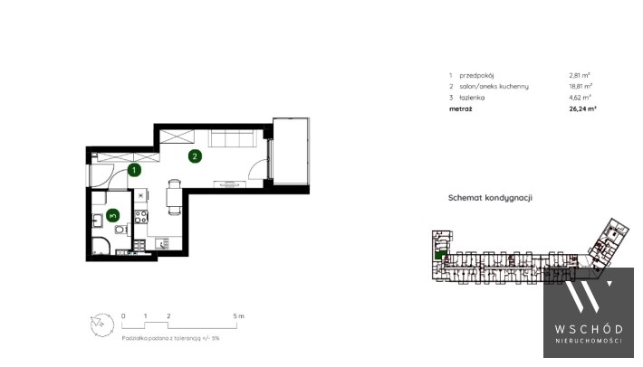 o pow. 26m2 położone na 3 piętrze 4 piętrowego bloku z windą.