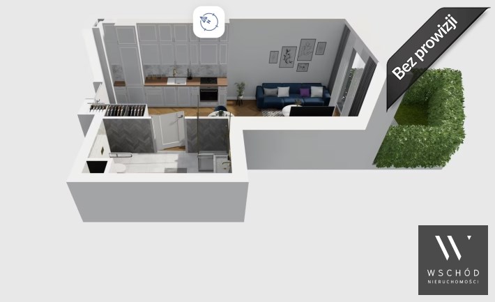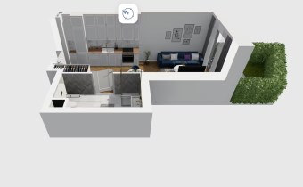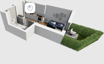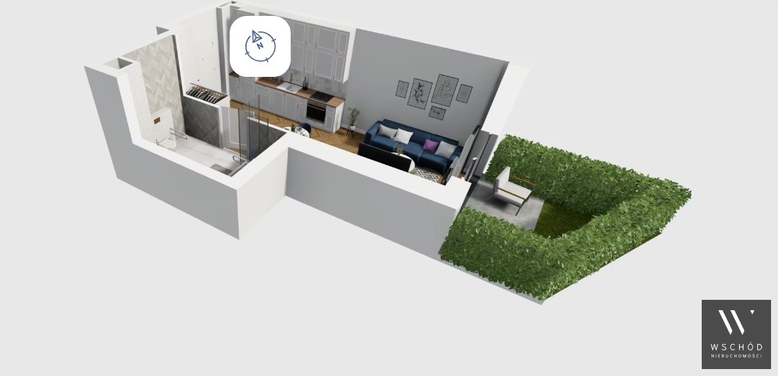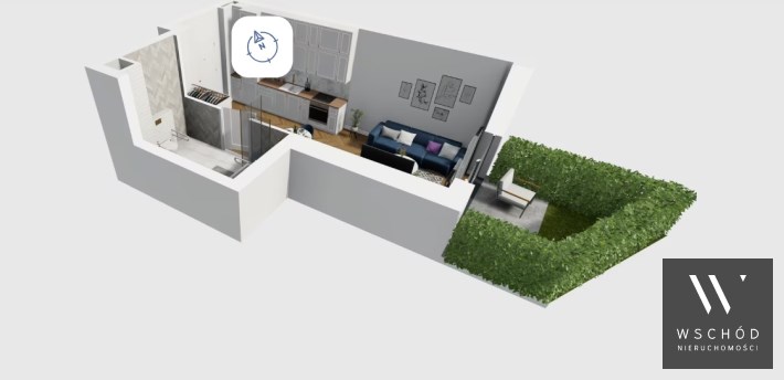 Mieszkanie składające się z pokoju z aneksem kuchennym , przedpokoju, łazienki  oraz ogródka