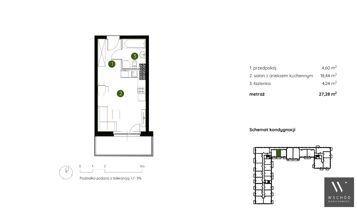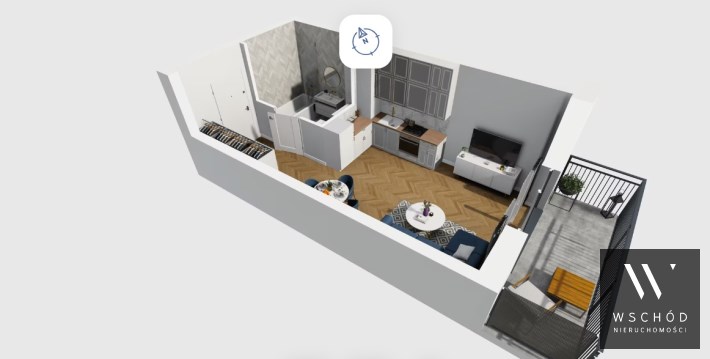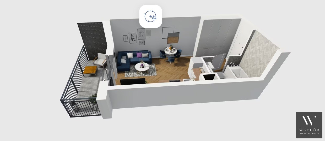 Mieszkanie składające się z salonu z aneksem kuchennym , przedpokoju, łazienki oraz balkonu