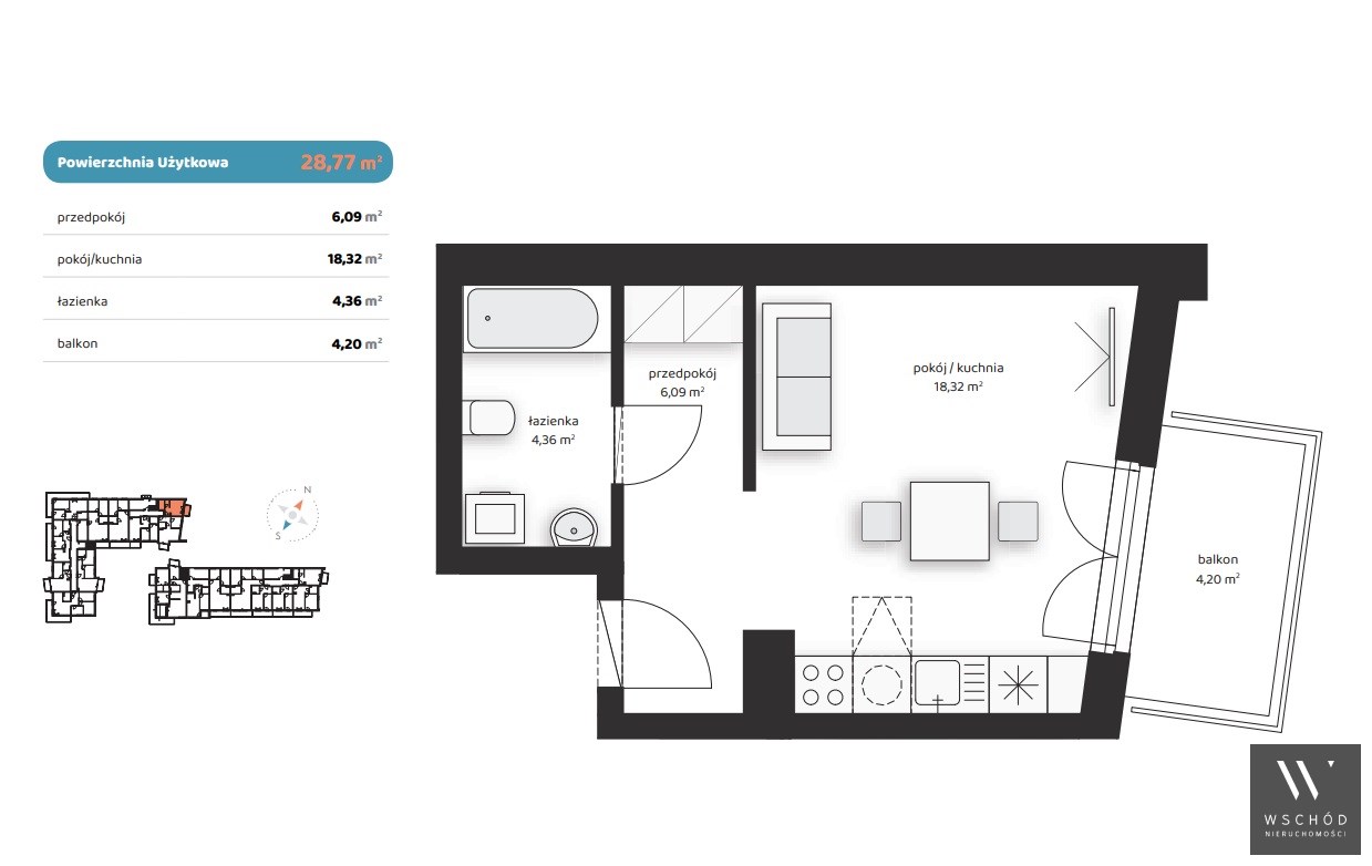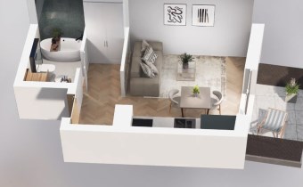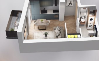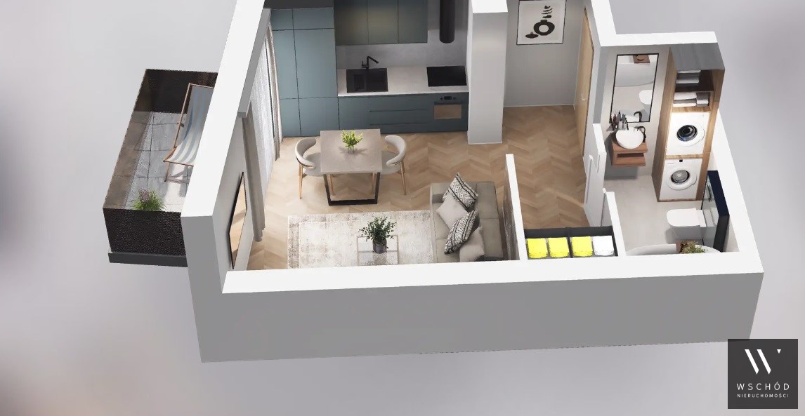 Mieszkanie składające się z pokoju z aneksem kuchennym, przedpokoju, łazienki oraz balkonu