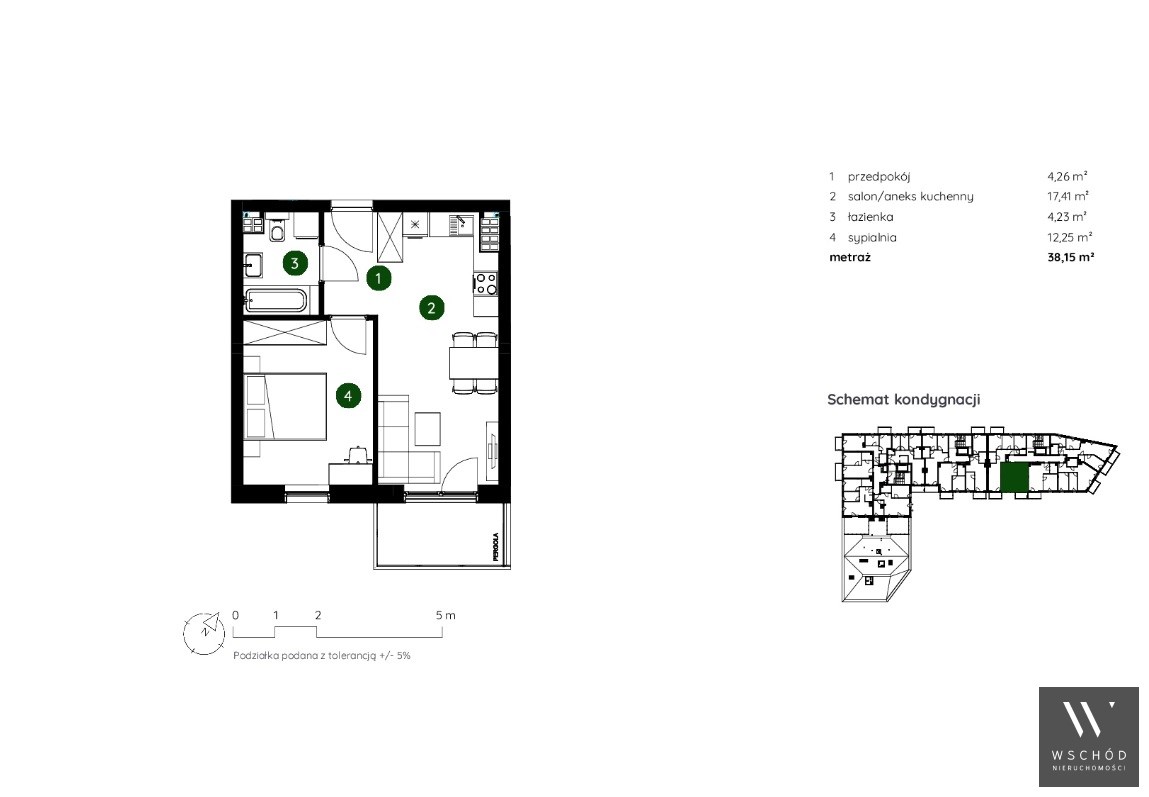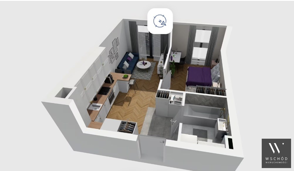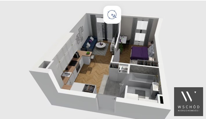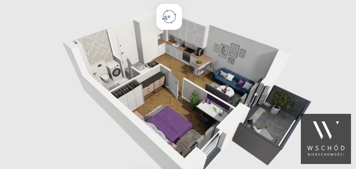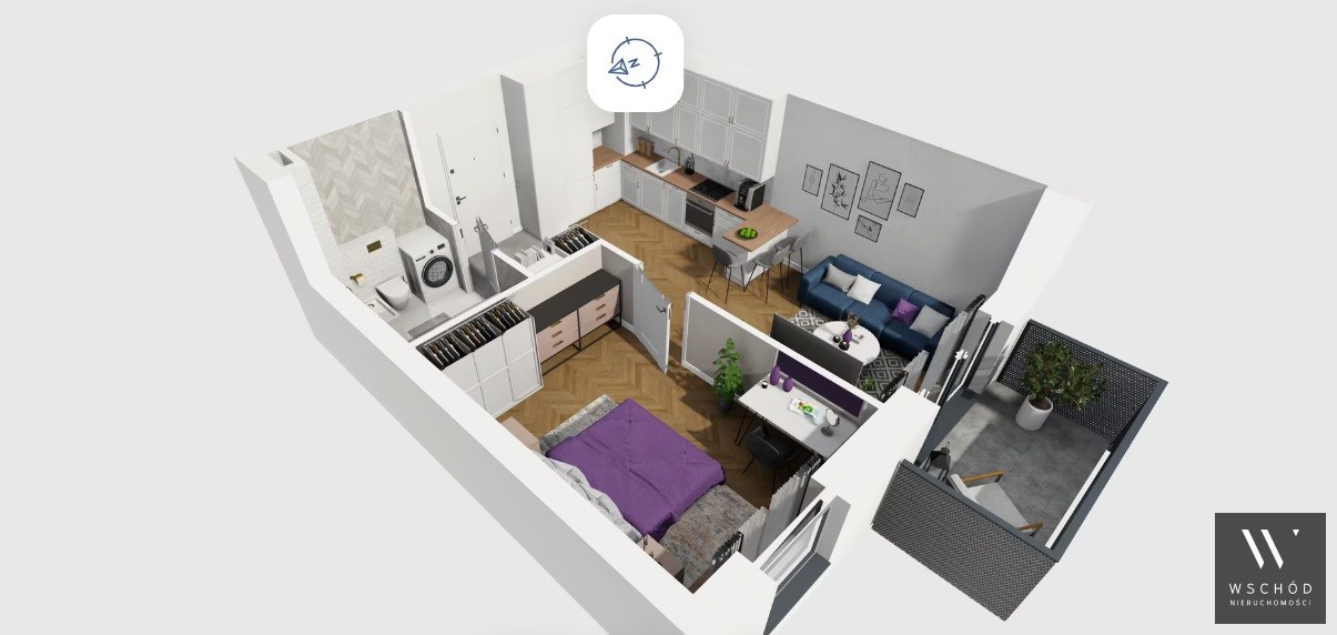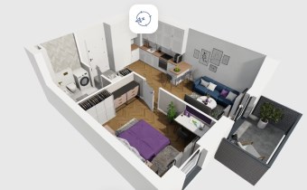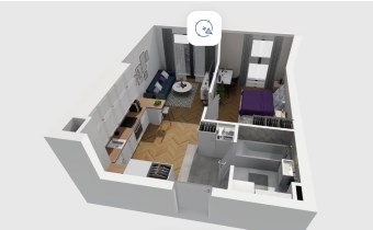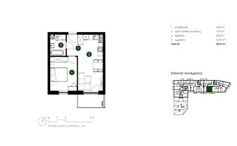 Mieszkanie składające się z salonu z aneksem kuchennym, sypialni, przedpokoju, łazienki oraz balkonu.