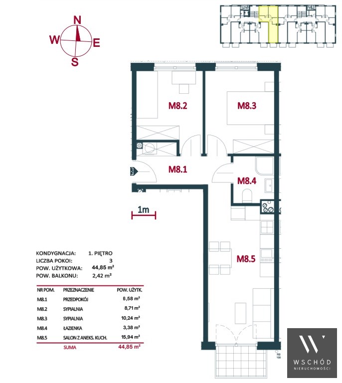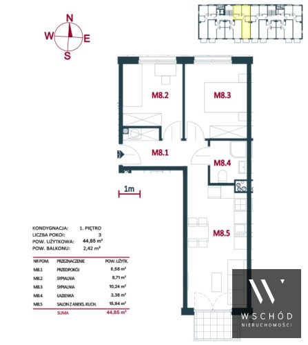 ustawne 3 pokojowe mieszkanie o pow. 44m2 położone na 1 piętrze 3 piętrowego bloku z windą.