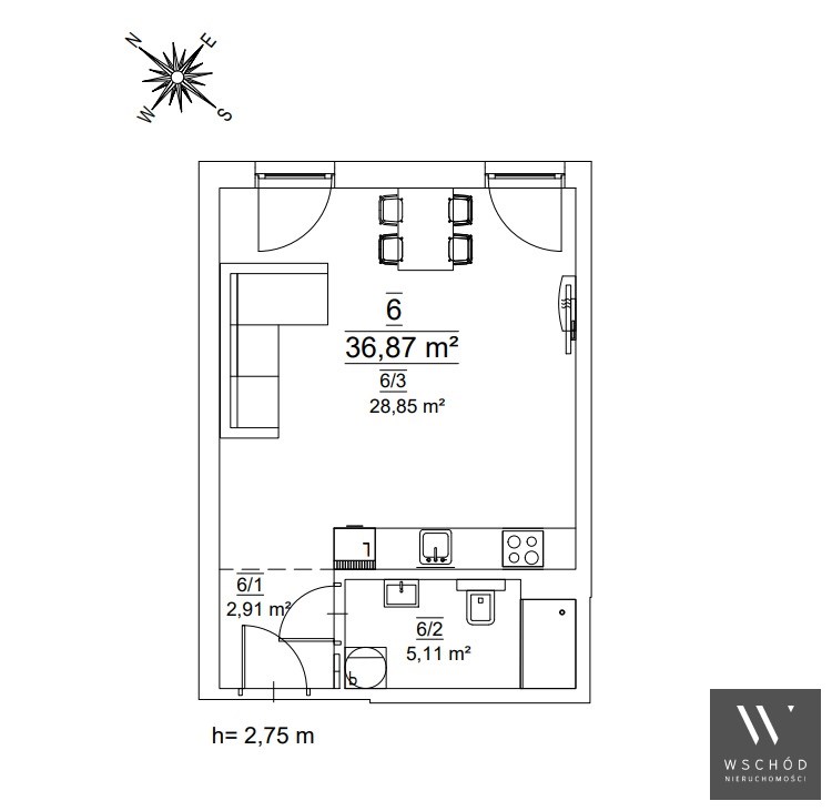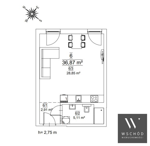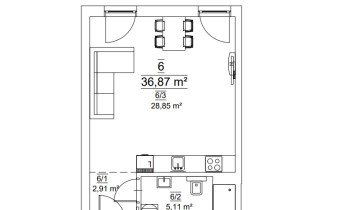 Mieszkanie składające się z pokoju z aneksem kuchennym, przedpokoju oraz łazienki.
