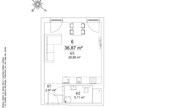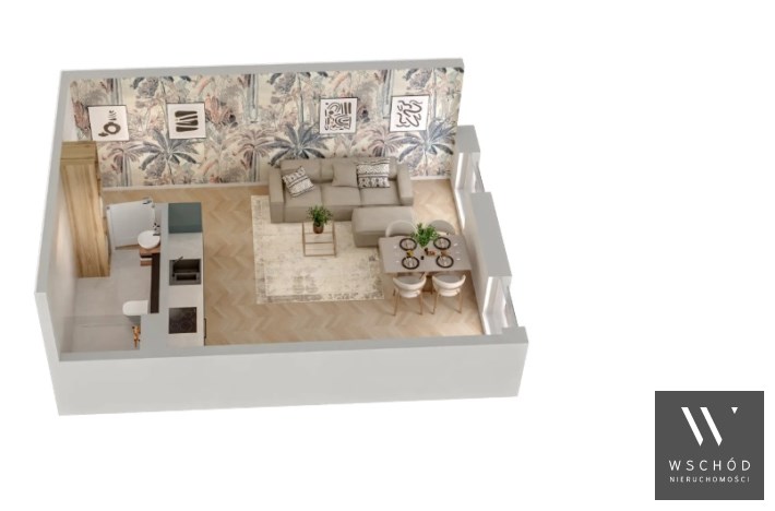 Mieszkanie składające się z pokoju z aneksem kuchennym, przedpokoju oraz łazienki.