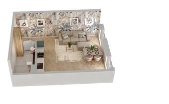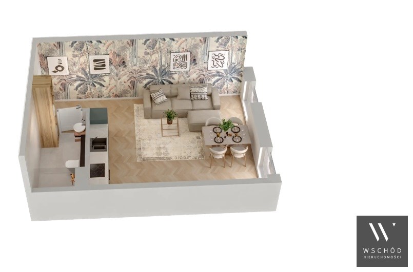 Mieszkanie składające się z pokoju z aneksem kuchennym, przedpokoju oraz łazienki.