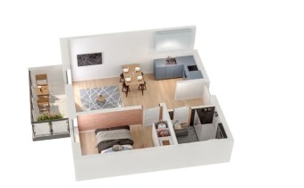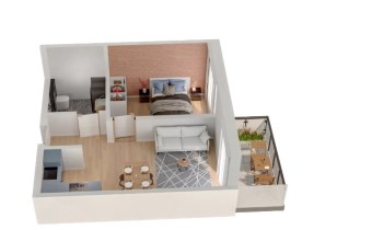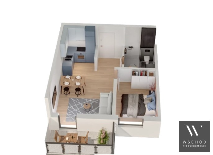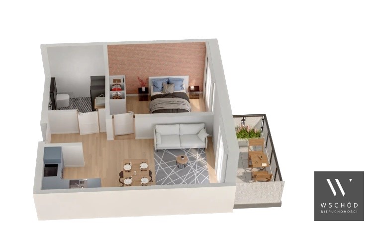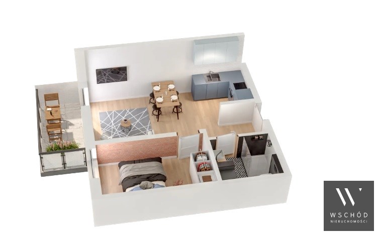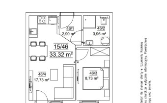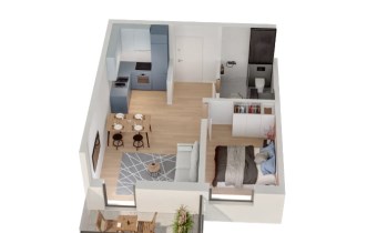 Mieszkanie składające się z salonu z aneksem kuchennym z wyjściem na balkon, sypialni, przedpokoju, łazienki.