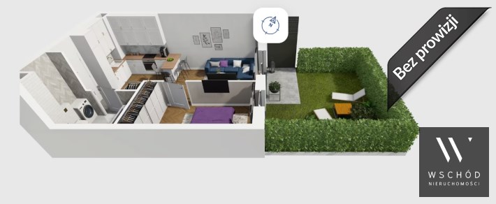 Mieszkanie składające się z salonu z aneksem kuchennym , sypialni, przedpokoju, łazienki oraz ogródka