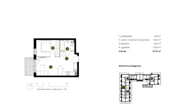 Mieszkanie składające się z salonu z aneksem kuchennym , sypialni, przedpokoju, łazienki oraz ogródka o pow. 19m2
