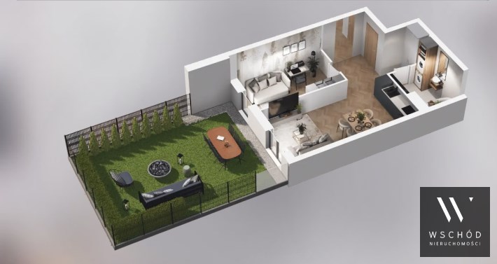 Mieszkanie składające się z salonu z aneksem kuchennym, sypialni, przedpokoju, łazienki oraz ogródka o pow. 42 m2
