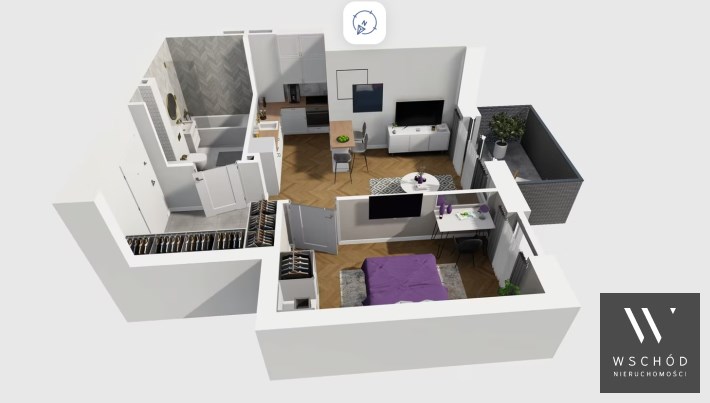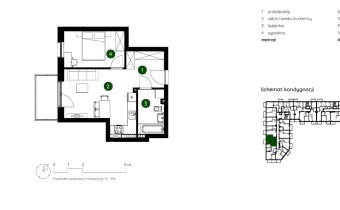 Mieszkanie składające się z salonu z aneksem kuchennym, sypialni, przedpokoju, łazienki oraz balkonu