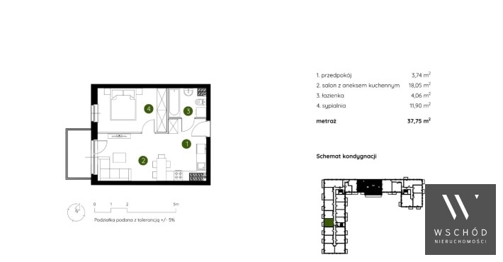 Mieszkanie składające się z salonu z aneksem kuchennym, sypialni, przedpokoju, łazienki oraz balkonu