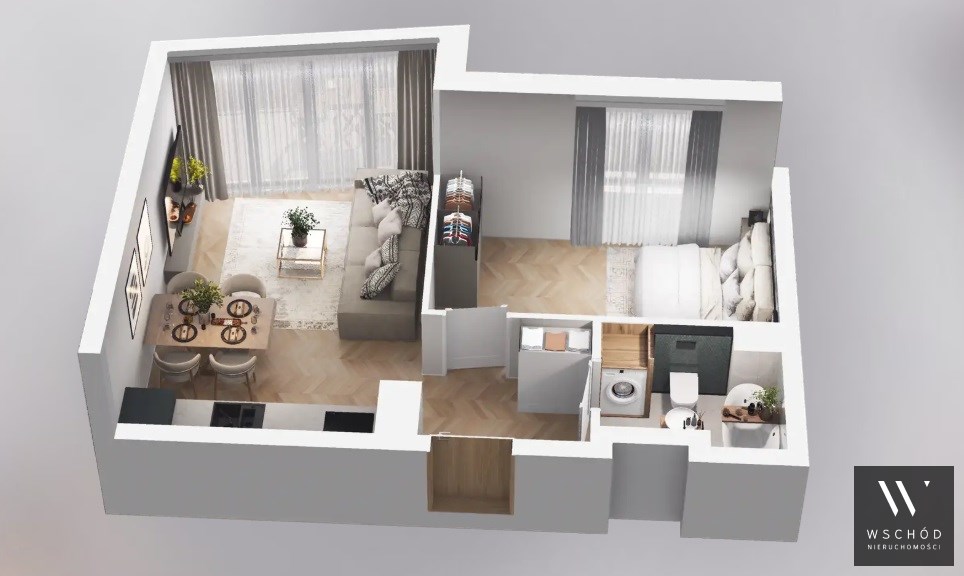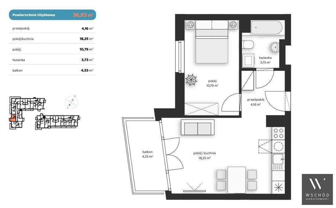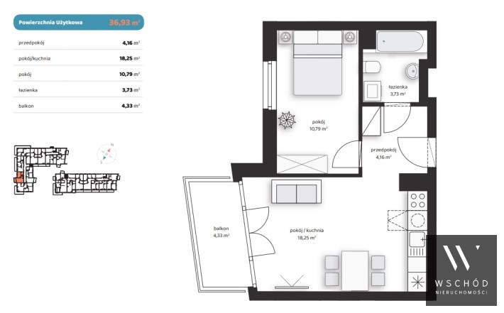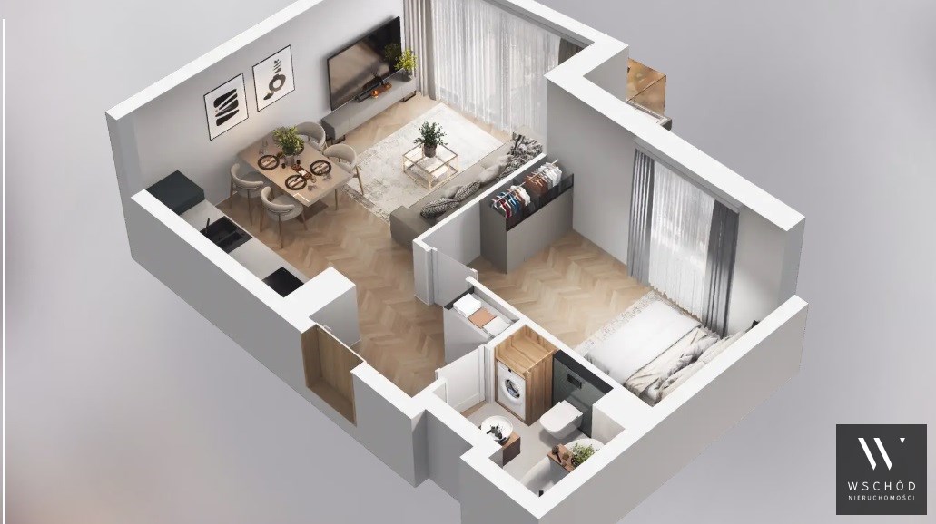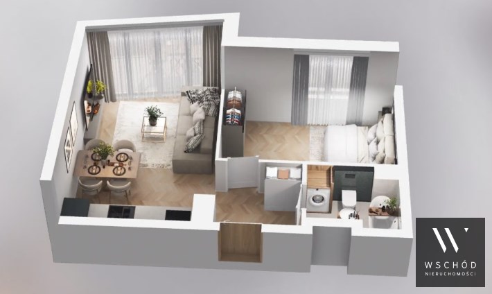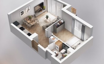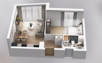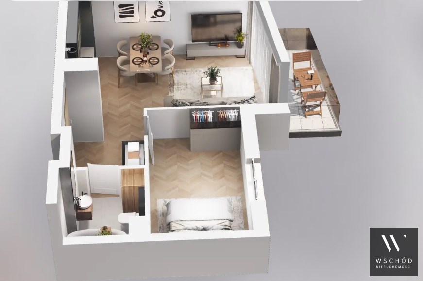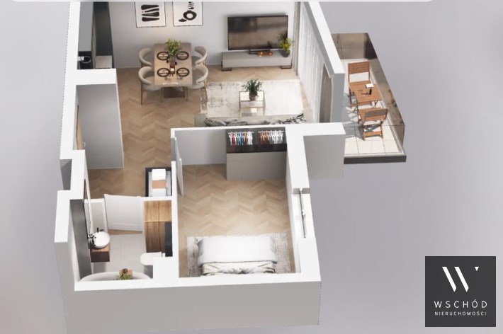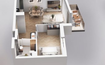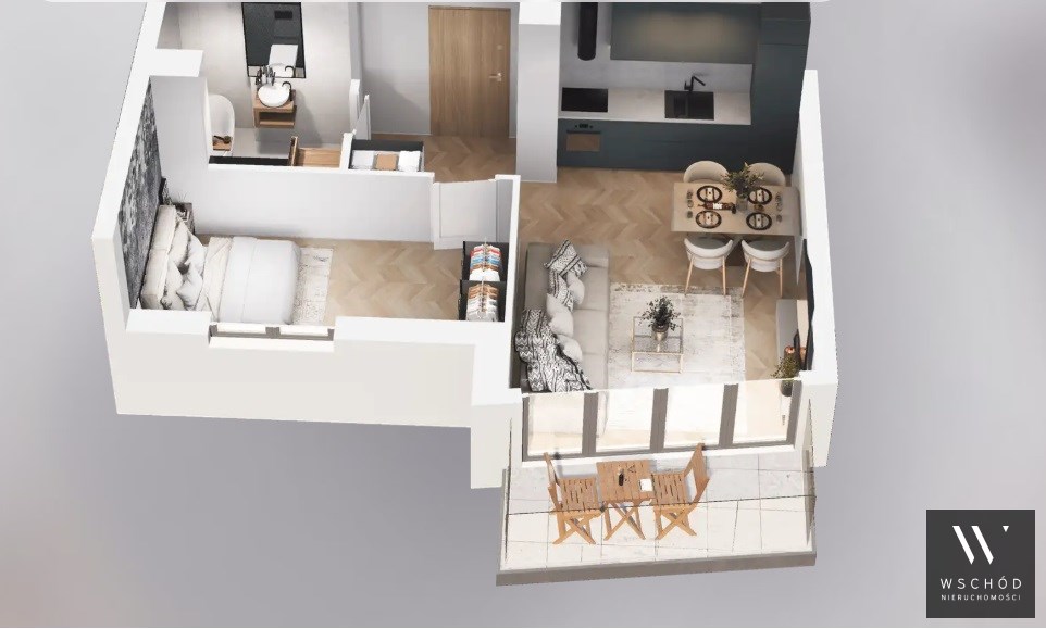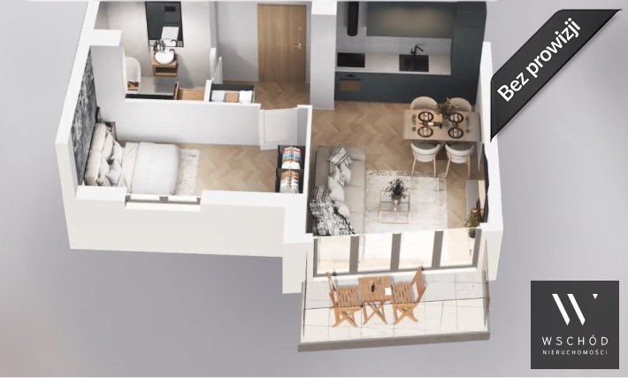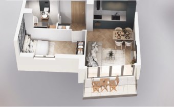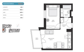 Mieszkanie składające się z salonu z aneksem kuchennym, sypialni, przedpokoju, łazienki oraz balkonu