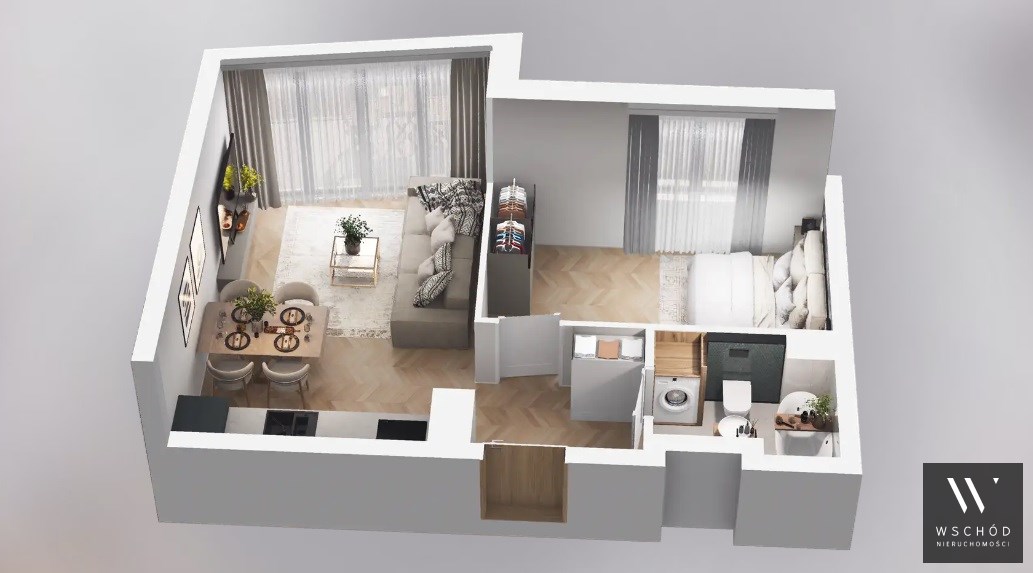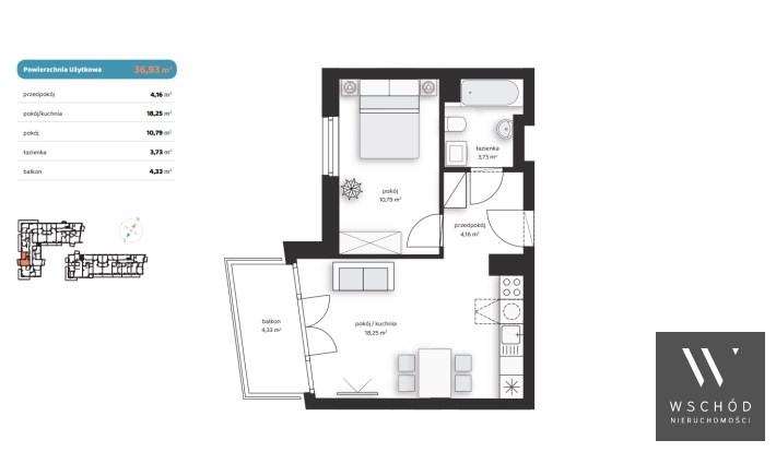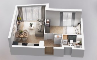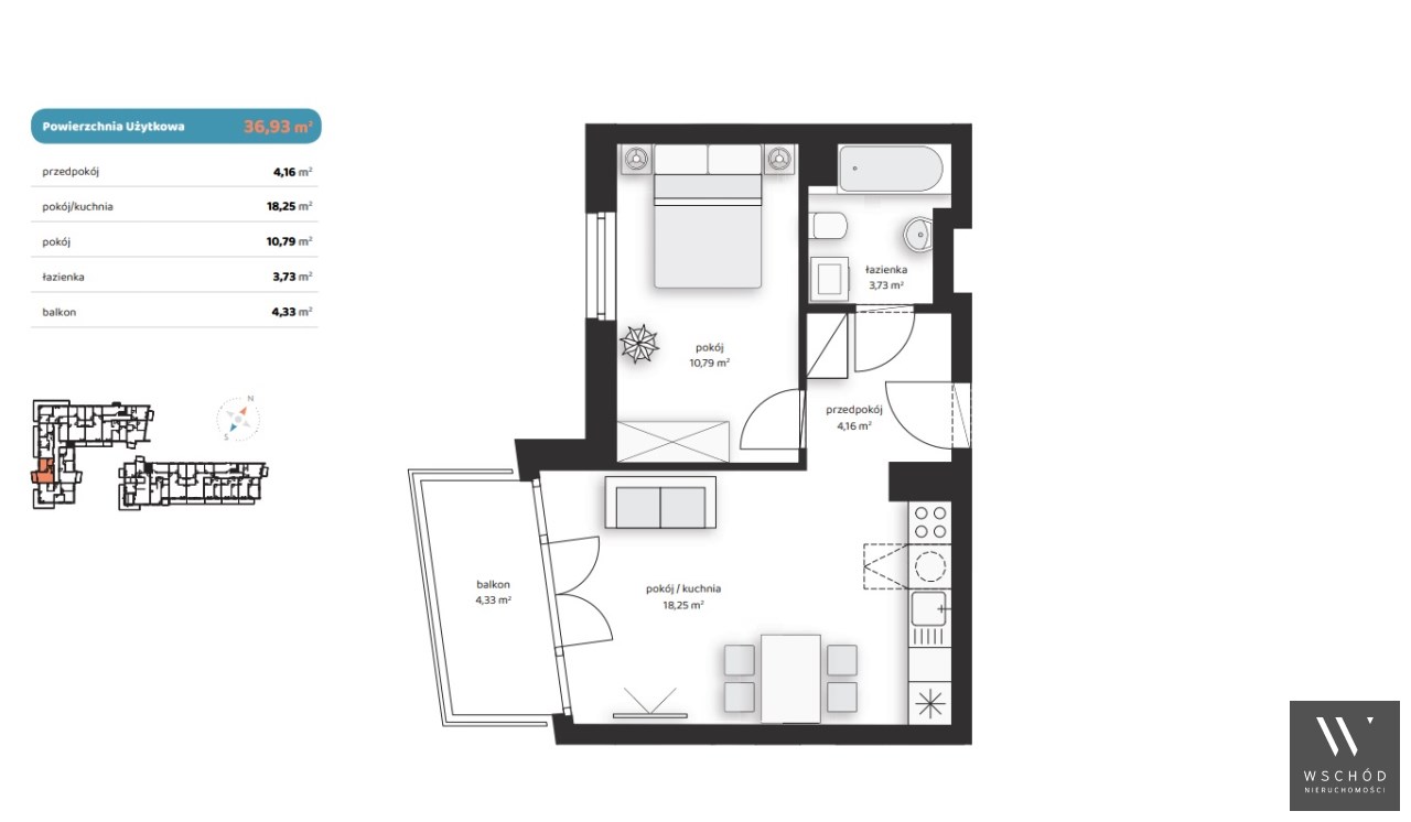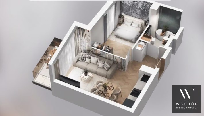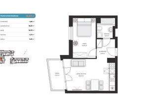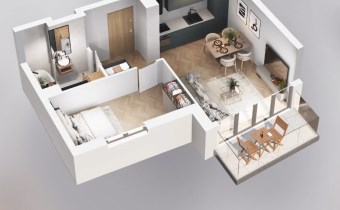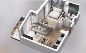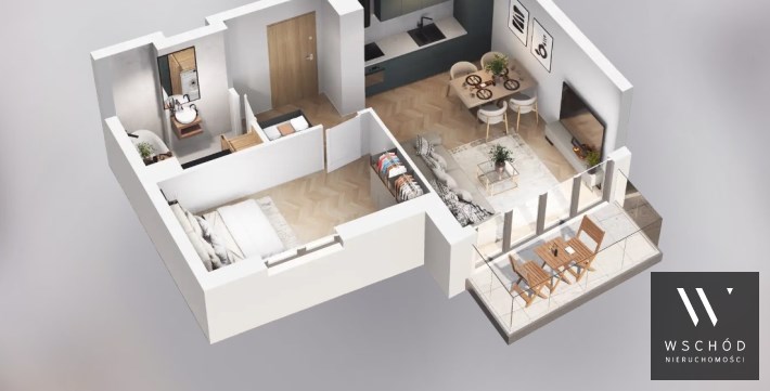 Mieszkanie składające się z salonu z aneksem kuchennym, sypialni, przedpokoju, łazienki oraz balkonu