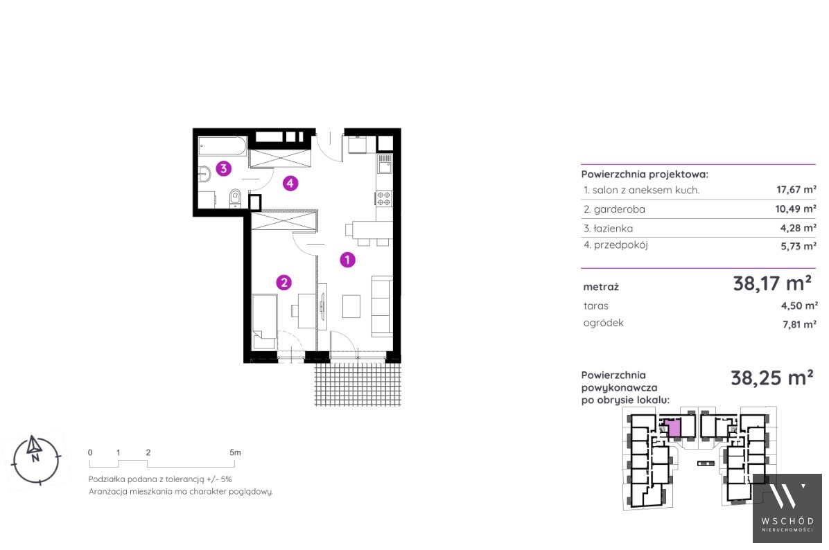 Mieszkanie składające się z salonu z aneksem kuchennym , sypialni, przedpokoju, łazienki oraz ogródka