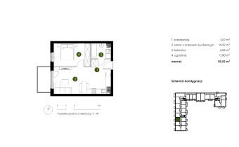 Mieszkanie składające się z salonu z aneksem kuchennym , sypialni, przedpokoju, łazienki  oraz balkonu