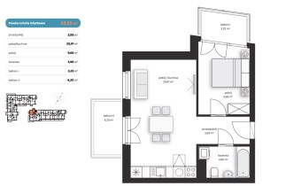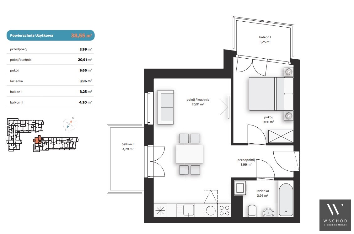 Mieszkanie składające się z salonu z aneksem kuchennym, sypialni, przedpokoju, łazienki oraz dwóch balkonów