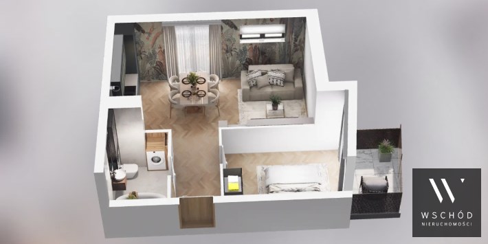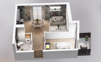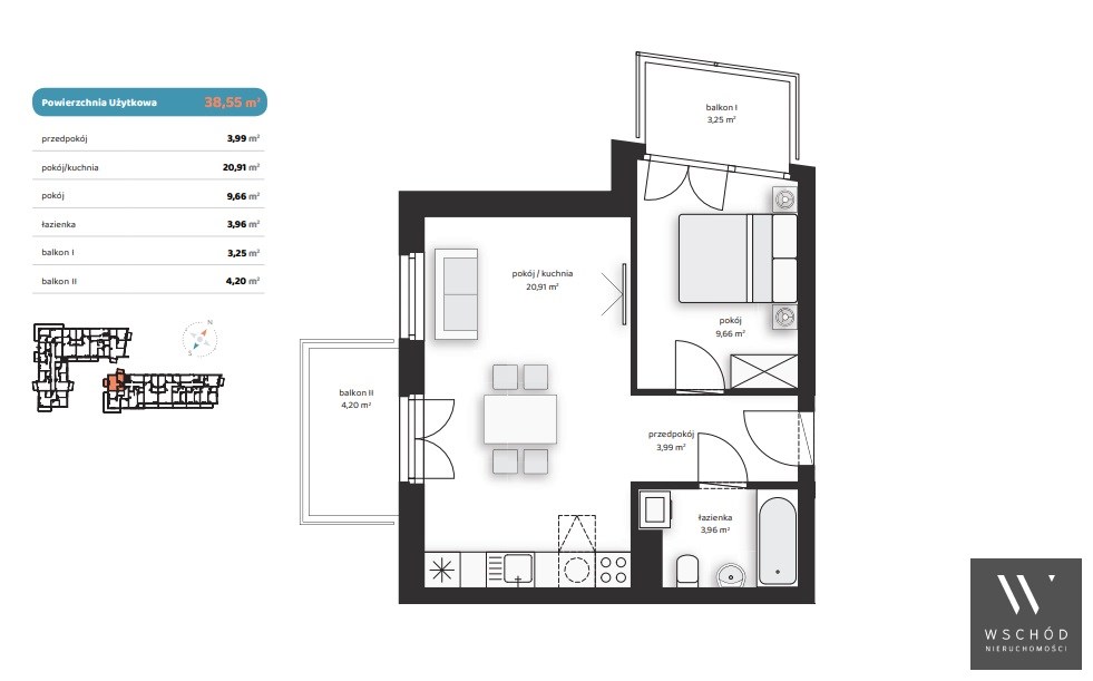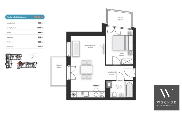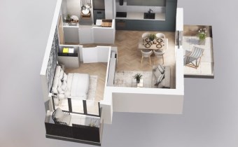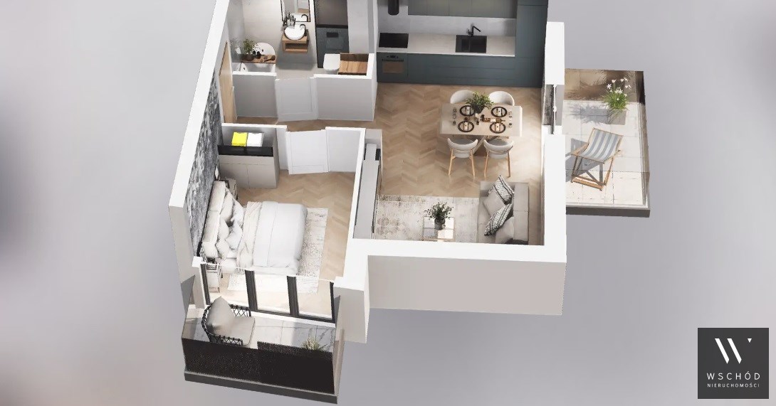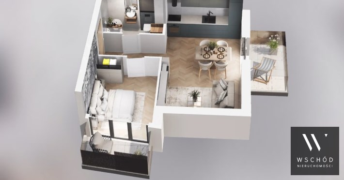 Mieszkanie składające się z salonu z aneksem kuchennym, sypialni, przedpokoju, łazienki oraz dwóch balkonów