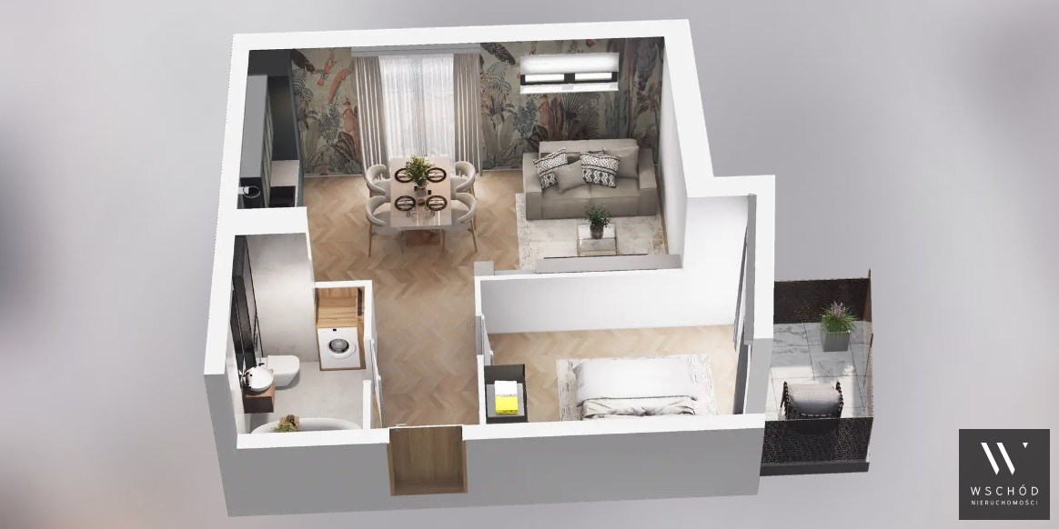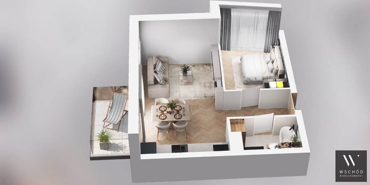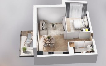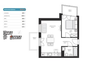Mieszkanie składające się z salonu z aneksem kuchennym, sypialni, przedpokoju, łazienki oraz dwóch balkonów