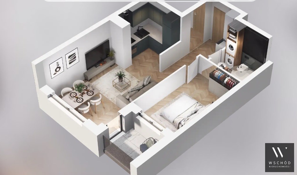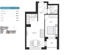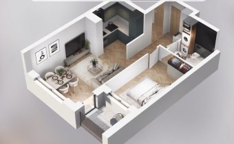 Mieszkanie składające się z salonu z aneksem kuchennym, sypialni, przedpokoju, łazienki oraz loggi