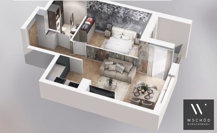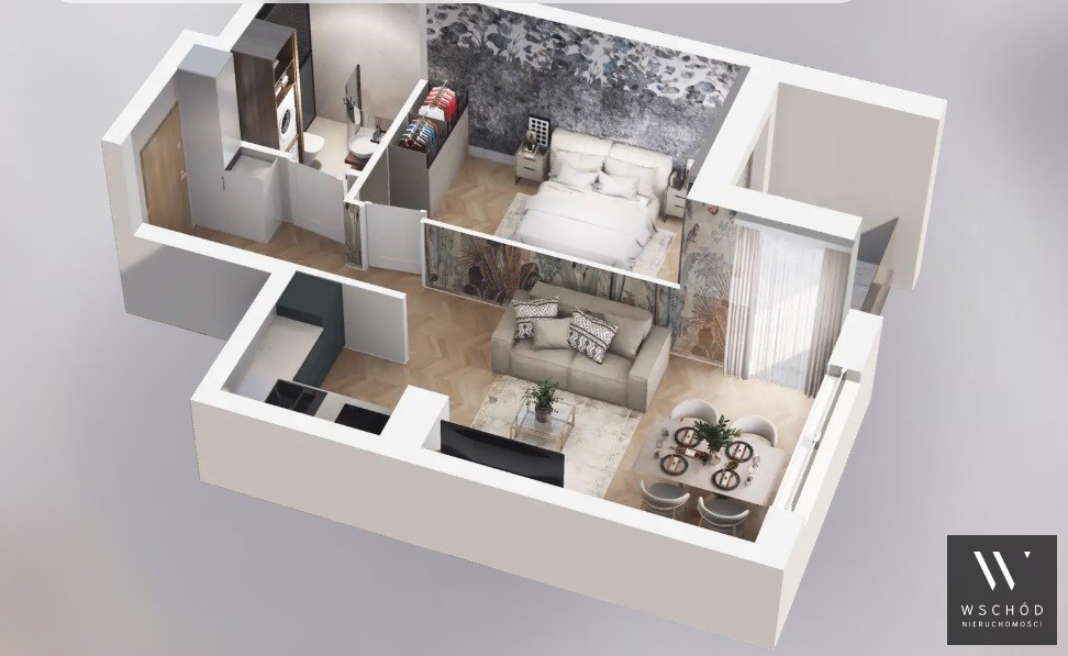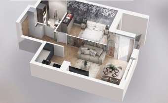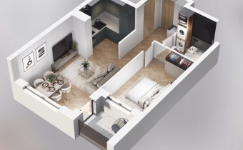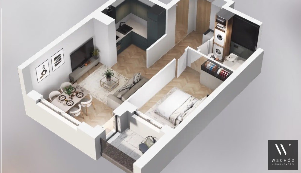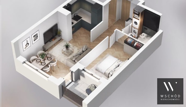 Mieszkanie składające się z salonu z aneksem kuchennym, sypialni, przedpokoju, łazienki oraz loggi