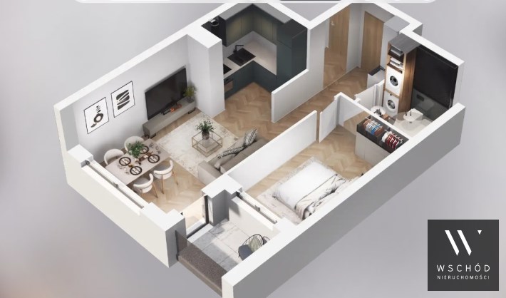 Mieszkanie składające się z salonu z aneksem kuchennym, sypialni, przedpokoju, łazienki oraz loggi
