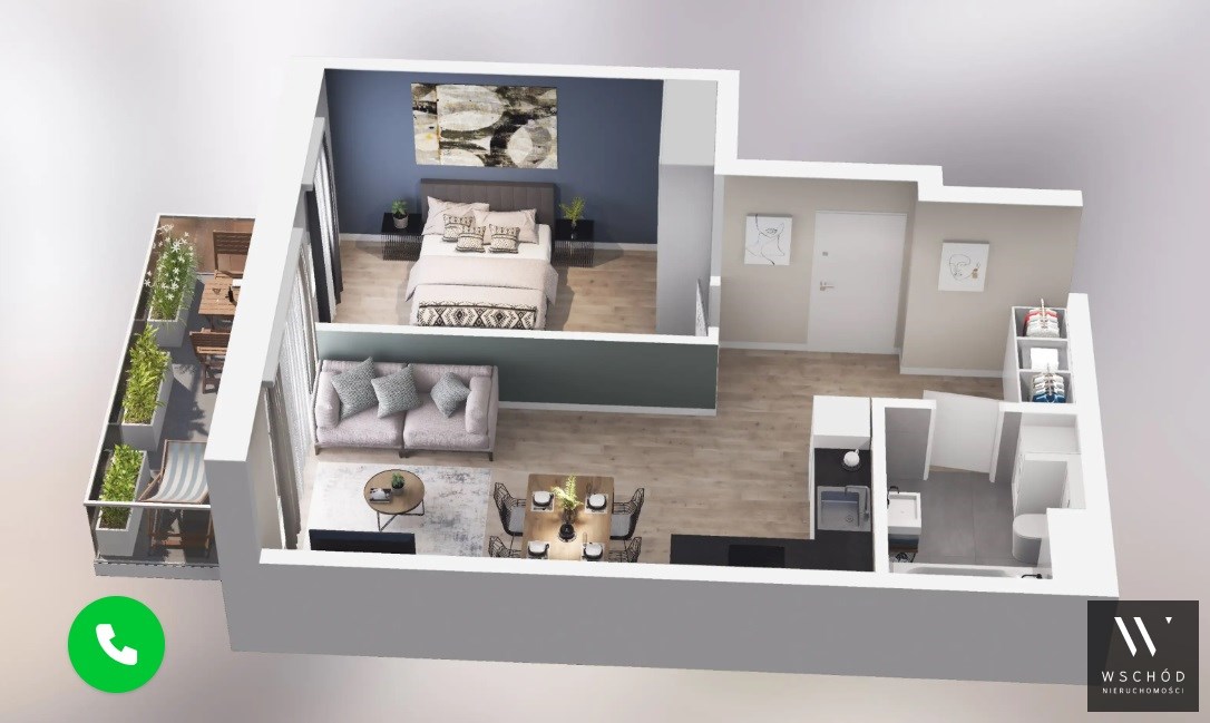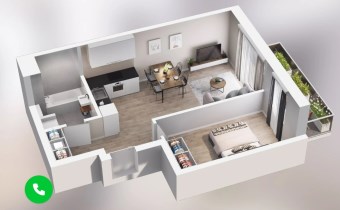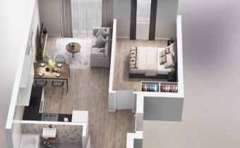 Mieszkanie składające się z salonu z aneksem kuchennym,  sypialni, przedpokoju, łazienki oraz balkonu