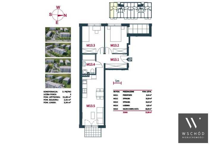 komfortowe 3 pokojowe mieszkanie o pow. 51 m2 położone na 3 piętrze 3 piętrowego bloku z windą.