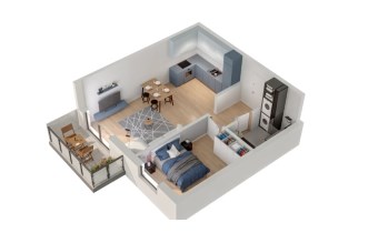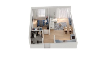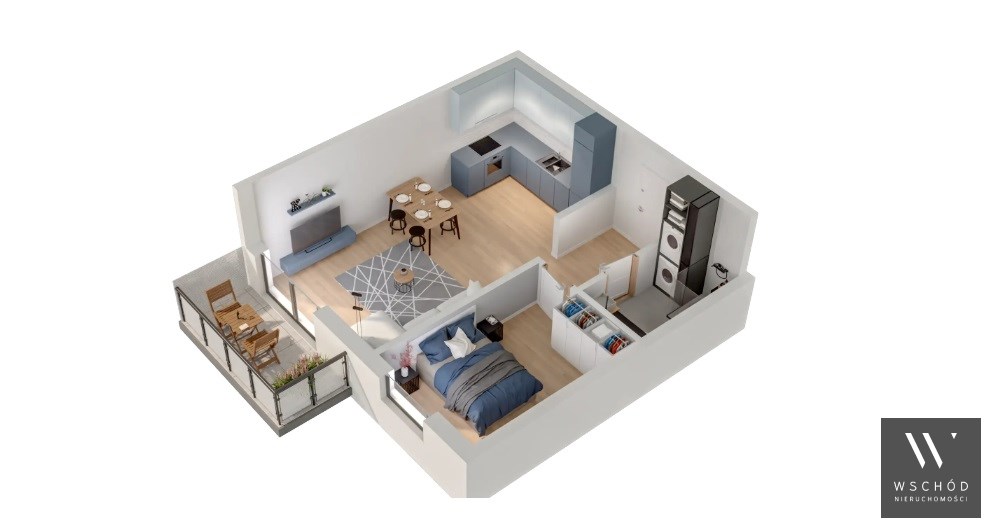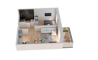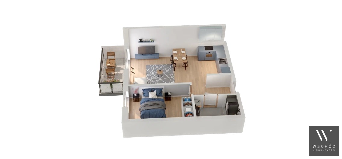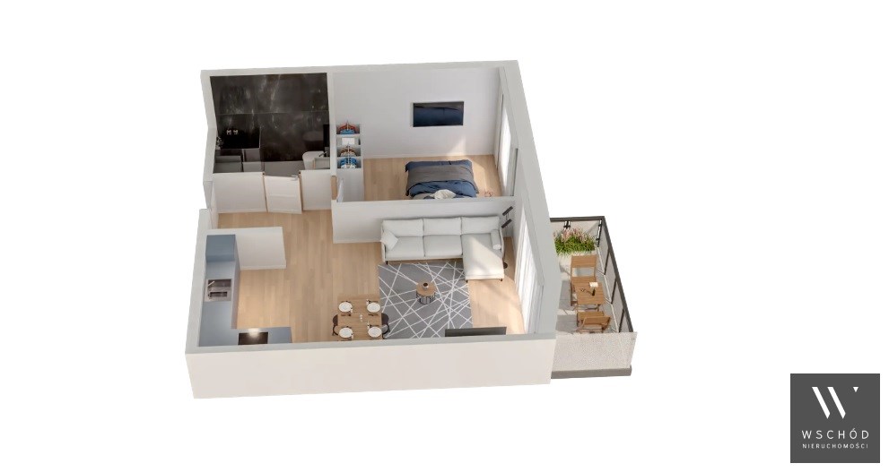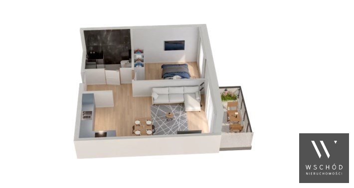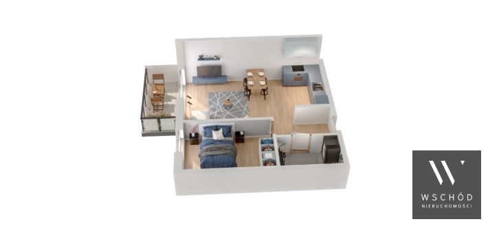 Mieszkanie składające się z salonu z aneksem kuchennym , sypialni, przedpokoju, łazienki oraz balkonu