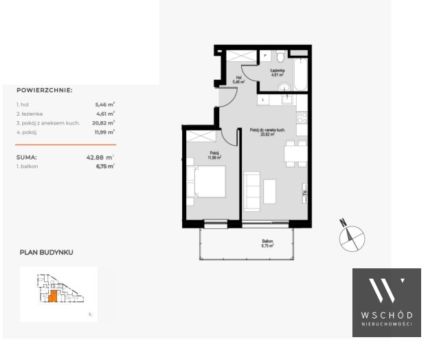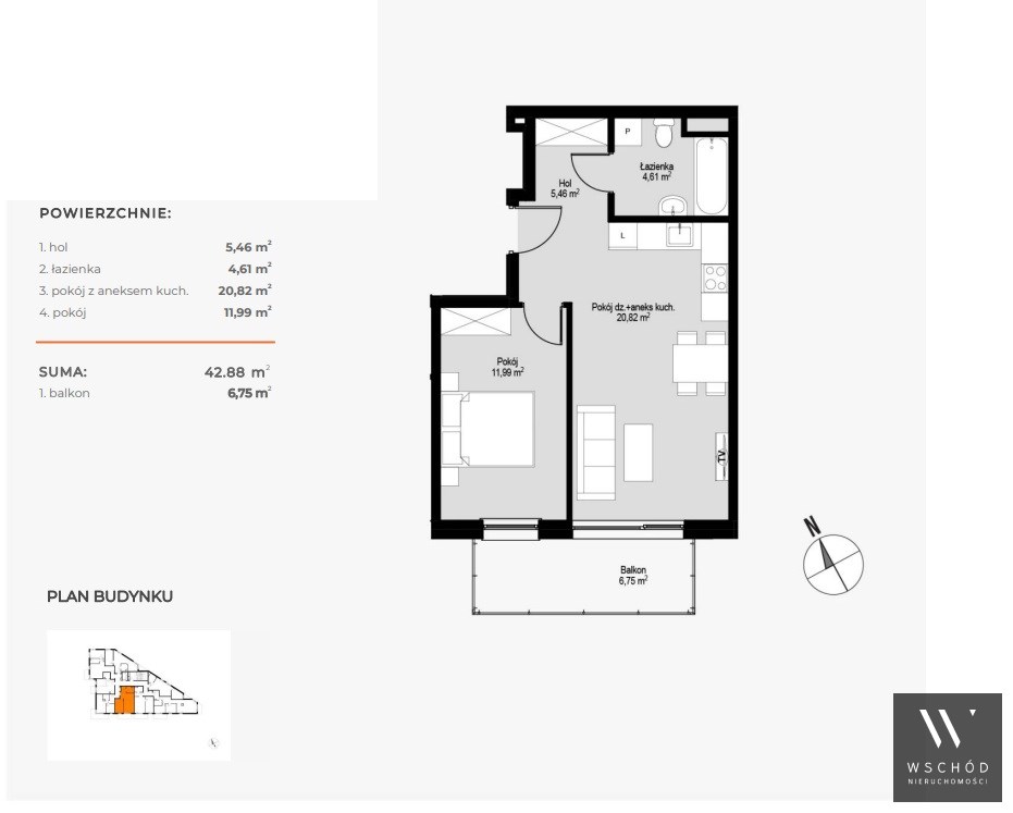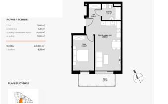 Mieszkanie składające się z salonu z aneksem kuchennym, sypialni, przedpokoju, łazienki oraz balkonu.