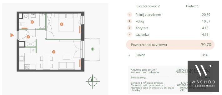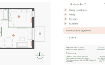 Mieszkanie składające się z salonu z aneksem kuchennym, sypialni, przedpokoju, łazienki z WC oraz balkonu.