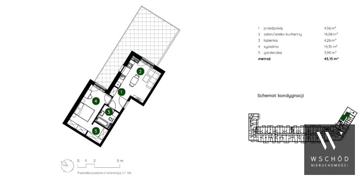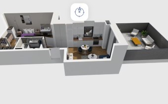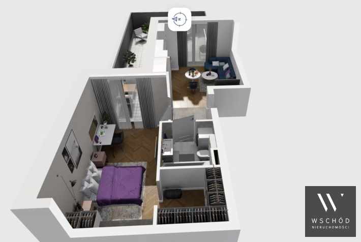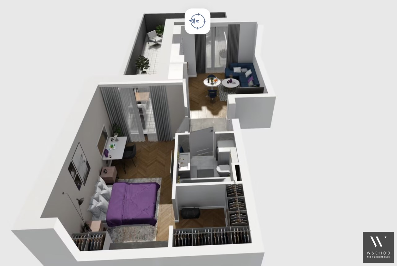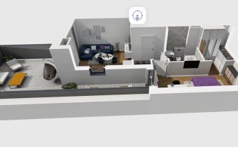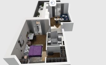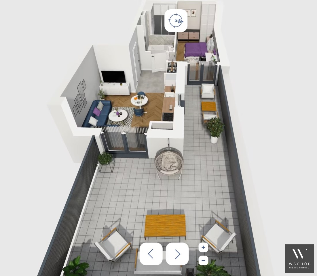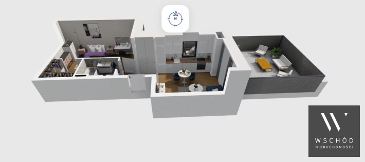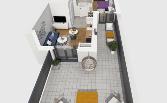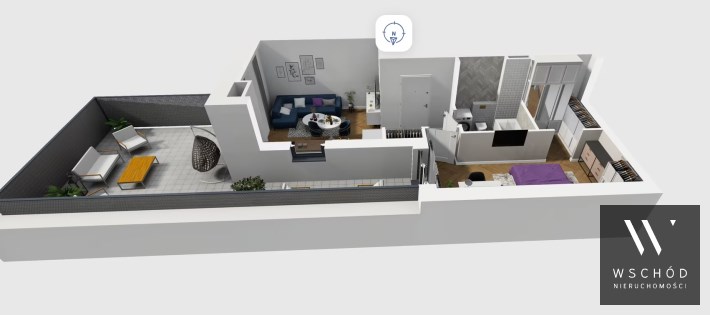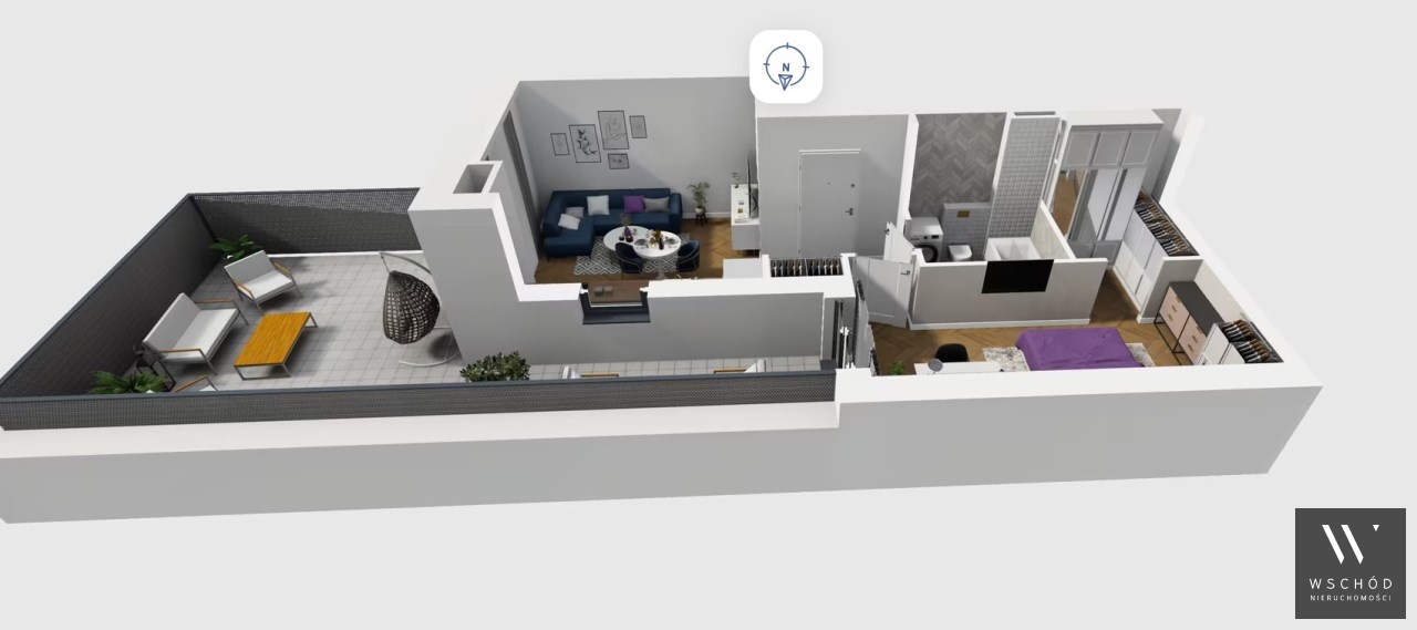 Mieszkanie składające się z salonu z aneksem kuchennym, sypialni, przedpokoju, łazienki oraz dużego tarasu.