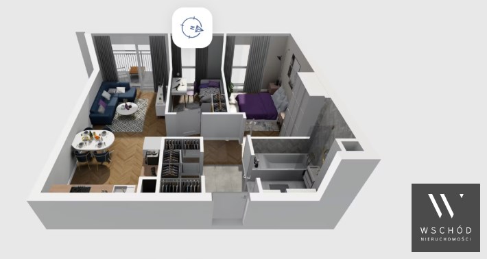 Mieszkanie składające się z salonu z aneksem kuchennym , dwóch sypialni, przedpokoju, łazienki, oraz balkonu