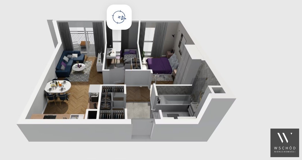 Mieszkanie składające się z salonu z aneksem kuchennym , dwóch sypialni, przedpokoju, łazienki, oraz balkonu
