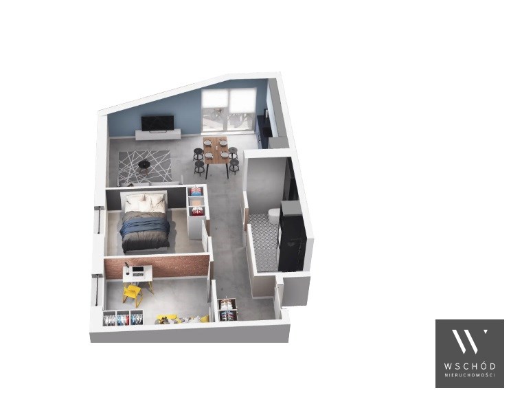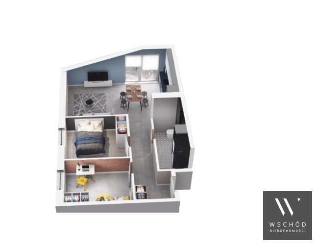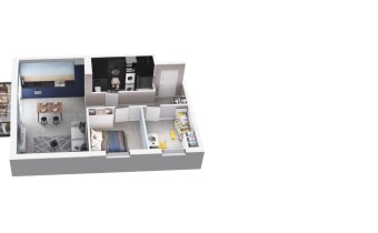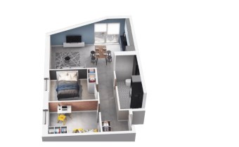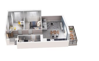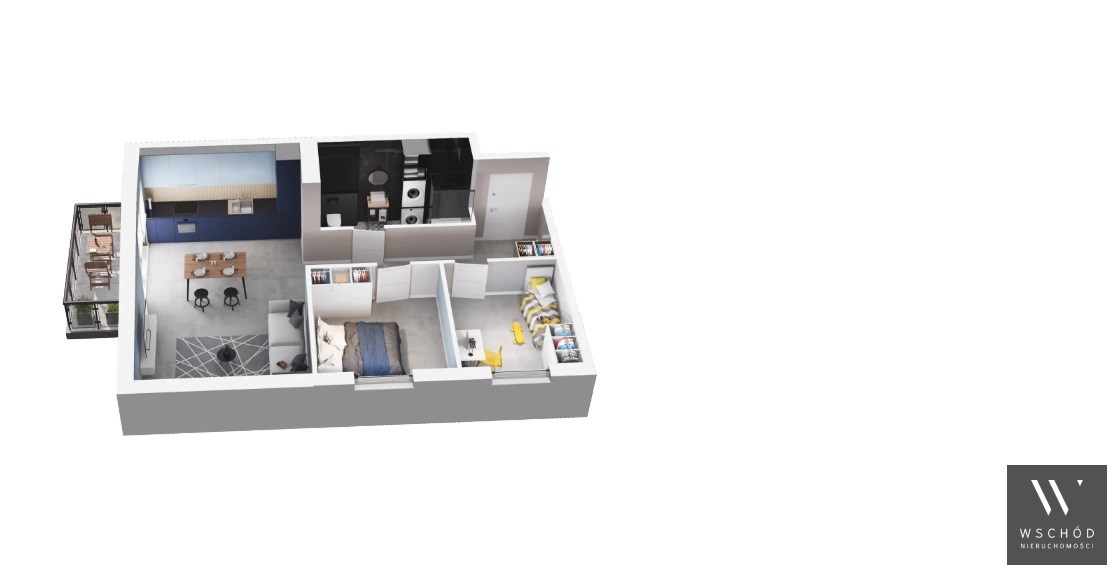 Mieszkanie składające się z salonu z aneksem kuchennym, dwóch sypialni, przedpokoju, łazienki oraz balkonu.