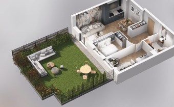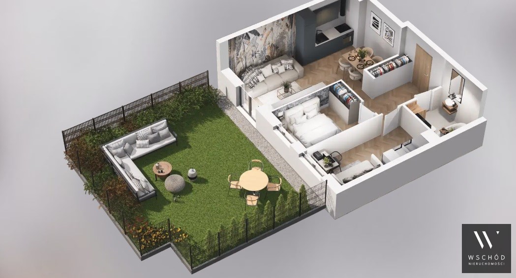 Mieszkanie składające się z salonu z aneksem kuchennym, dwóch sypialni, przedpokoju, łazienki oraz ogródka o pow. 51m2