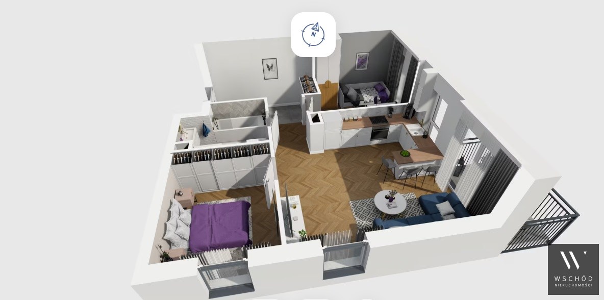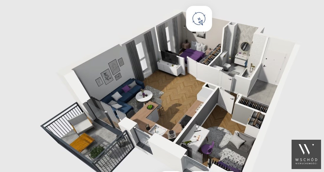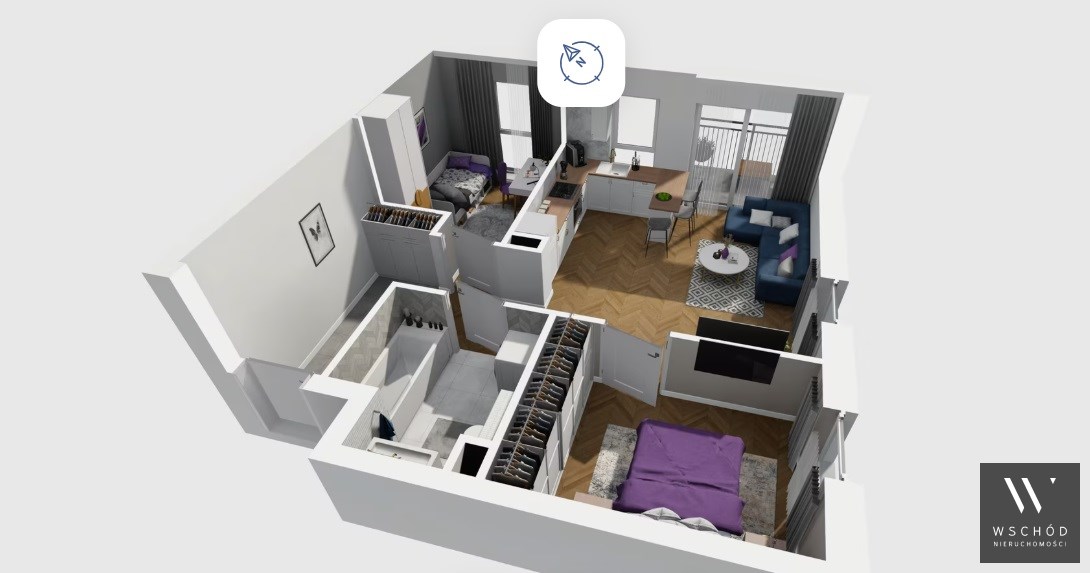 Mieszkanie składające się z salonu z aneksem kuchennym , dwóch sypialni, przedpokoju, łazienki oraz balkonu