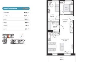 Mieszkanie składające się z salonu z aneksem kuchennym, dwóch sypialni, przedpokoju, łazienki oraz balkonu
