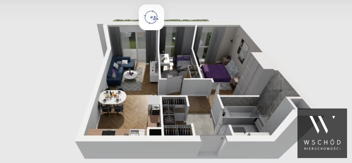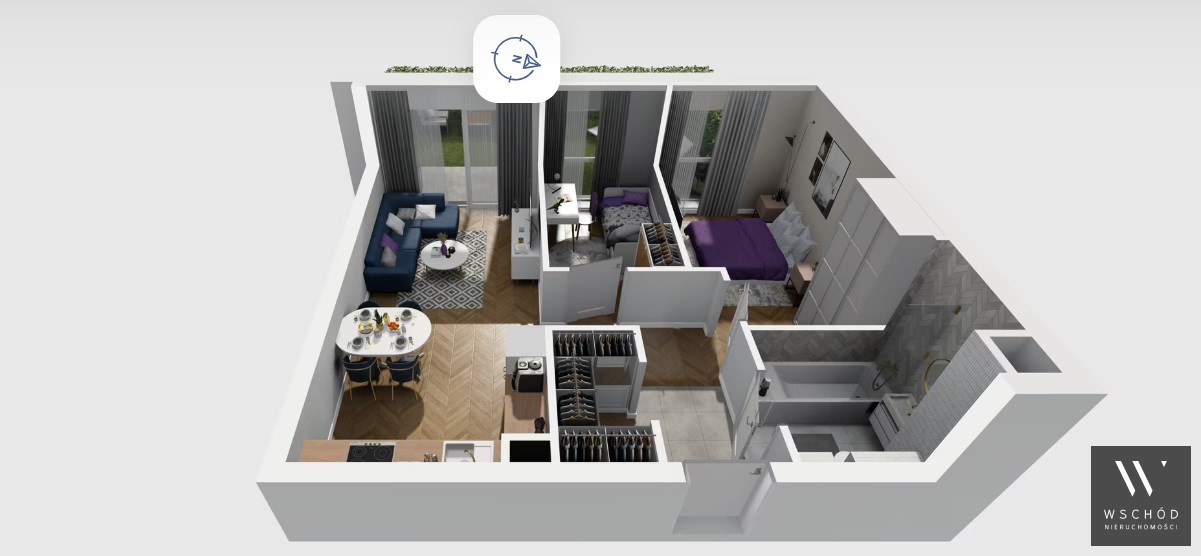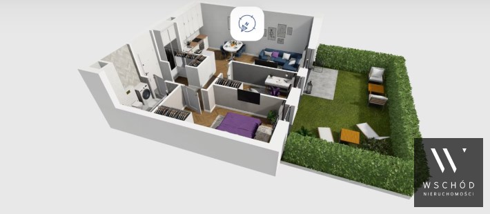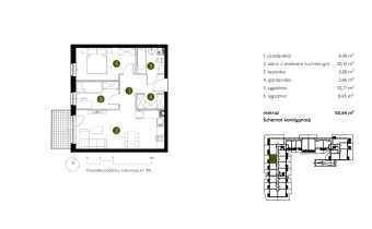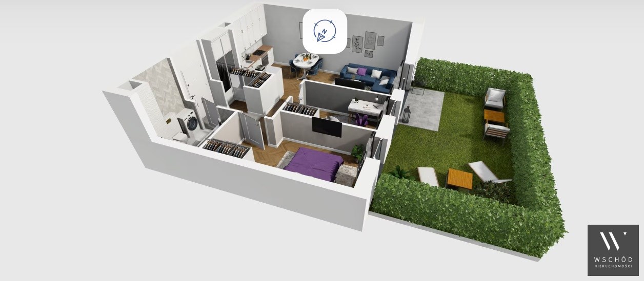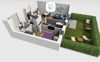 Mieszkanie składające się z salonu z aneksem kuchennym , dwóch sypialni, przedpokoju, łazienki oraz ogródka o pow. 24m2