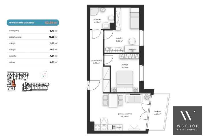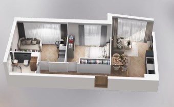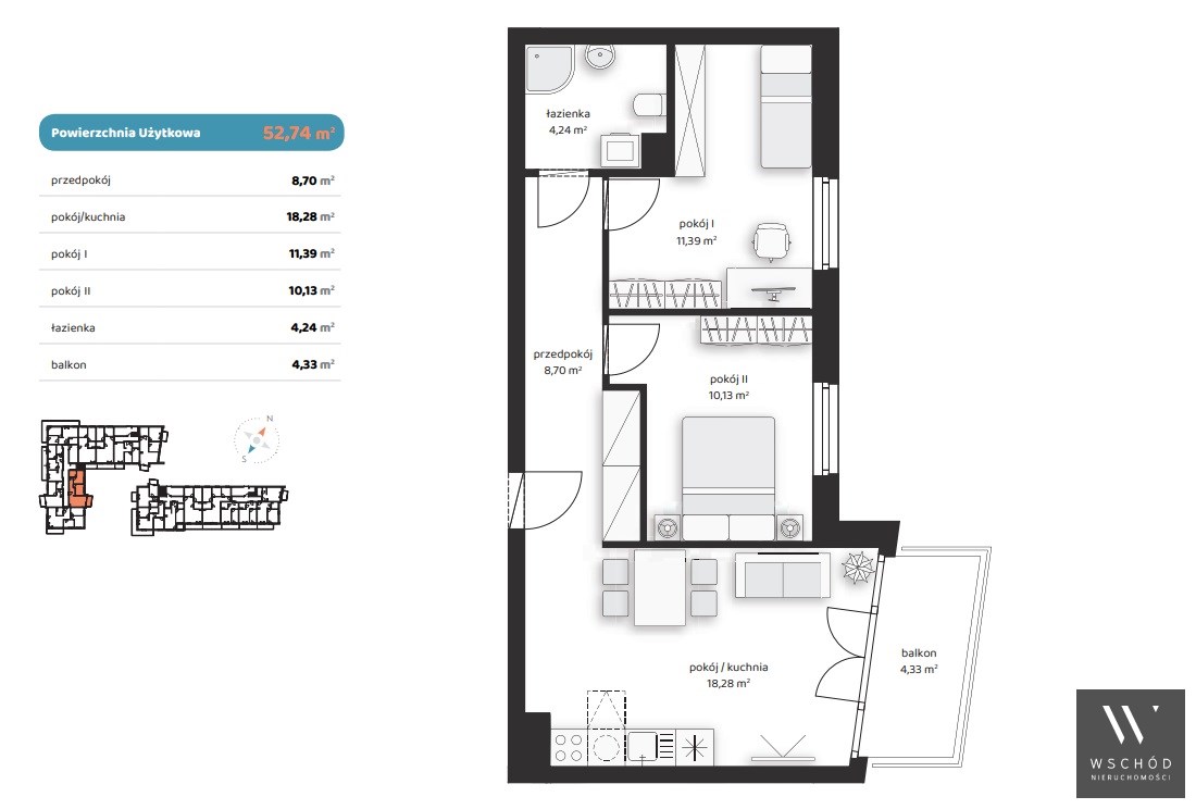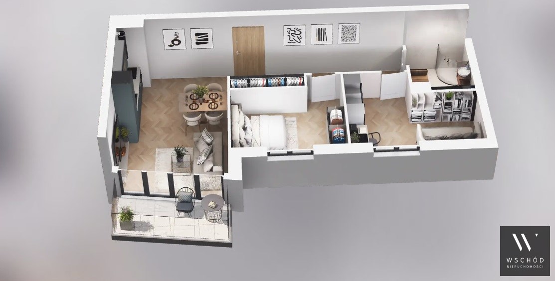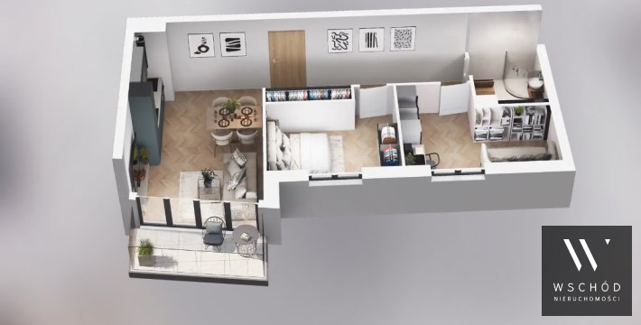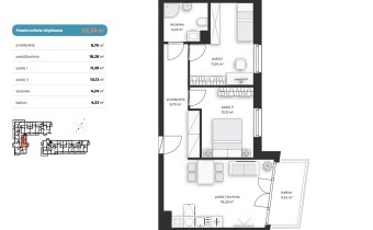 Mieszkanie składające się z salonu z aneksem kuchennym, dwóch sypialni, przedpokoju, łazienki oraz balkonu