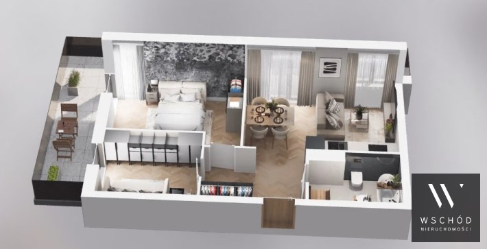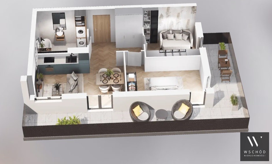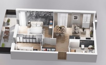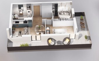 Mieszkanie składające się z salonu z aneksem kuchennym, dwóch sypialni, przedpokoju, łazienki oraz balkonu o pow. 25m2