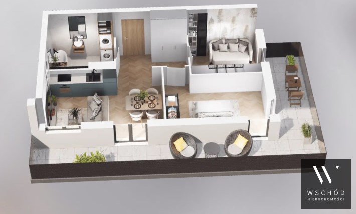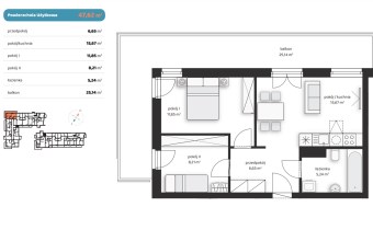 Mieszkanie składające się z salonu z aneksem kuchennym, dwóch sypialni, przedpokoju, łazienki oraz balkonu o pow. 25m2