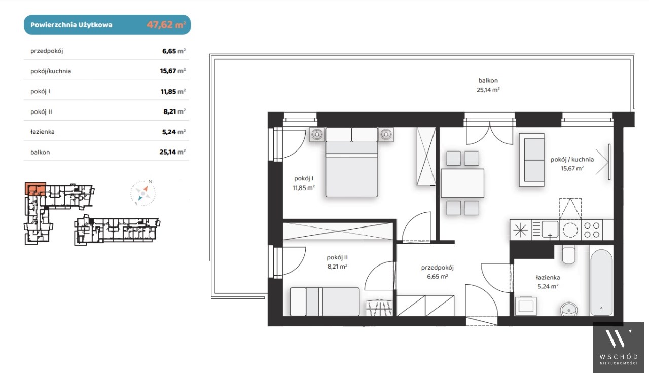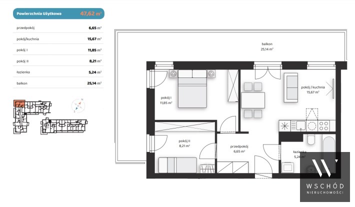 Mieszkanie składające się z salonu z aneksem kuchennym, dwóch sypialni, przedpokoju, łazienki oraz balkonu o pow. 25m2