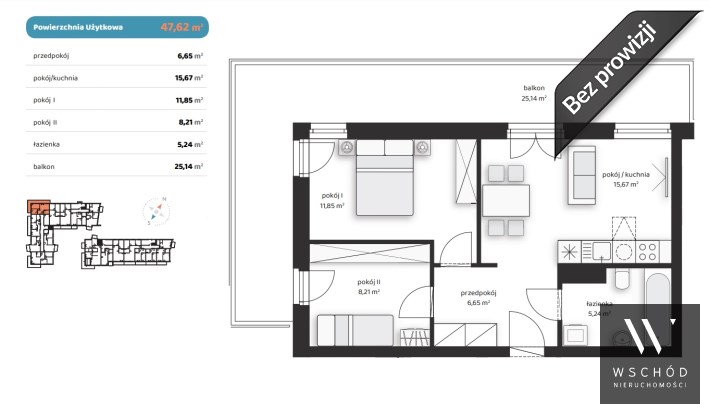 Mieszkanie składające się z salonu z aneksem kuchennym, dwóch sypialni, przedpokoju, łazienki oraz balkonu o pow. 25m2