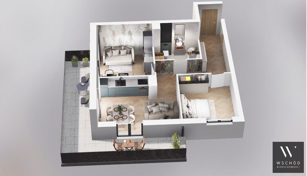 Mieszkanie składające się z salonu z aneksem kuchennym, dwóch sypialni, przedpokoju, łazienki oraz balkonu o pow. 19m2