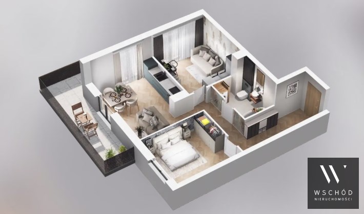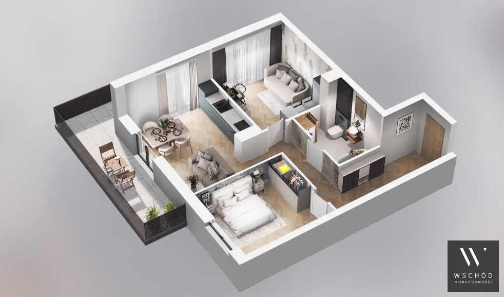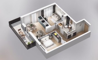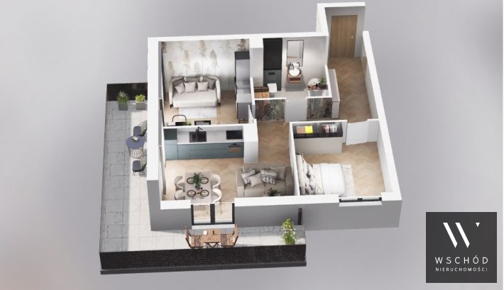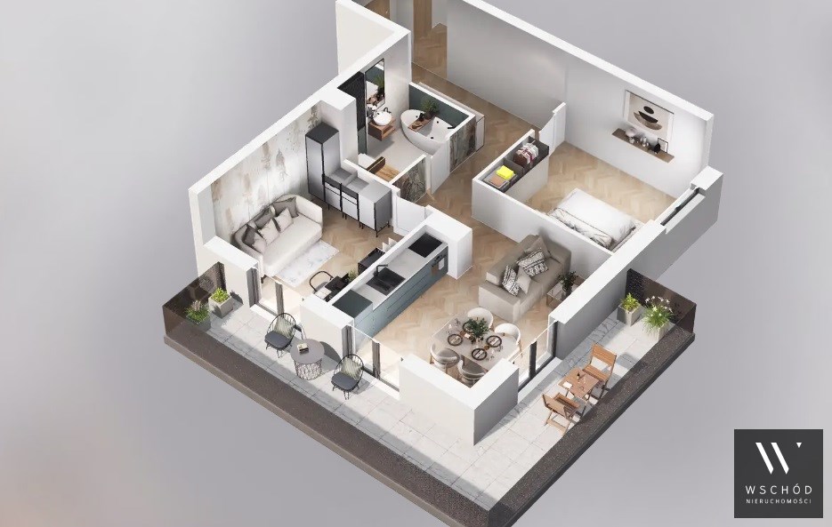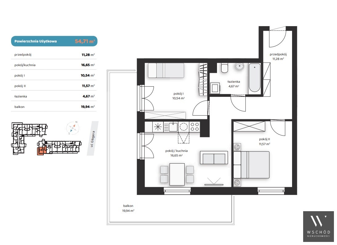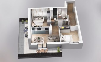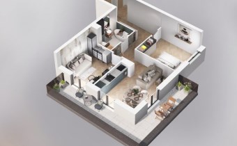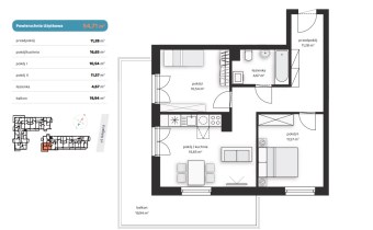 Mieszkanie składające się z salonu z aneksem kuchennym, dwóch sypialni, przedpokoju, łazienki oraz balkonu o pow. 19m2