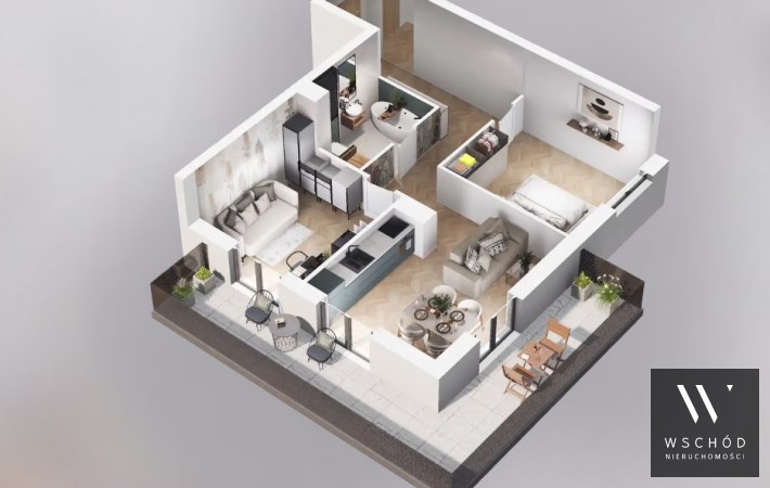Mieszkanie składające się z salonu z aneksem kuchennym, dwóch sypialni, przedpokoju, łazienki oraz balkonu o pow. 19m2