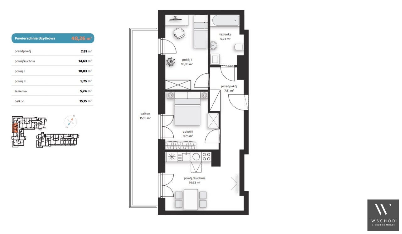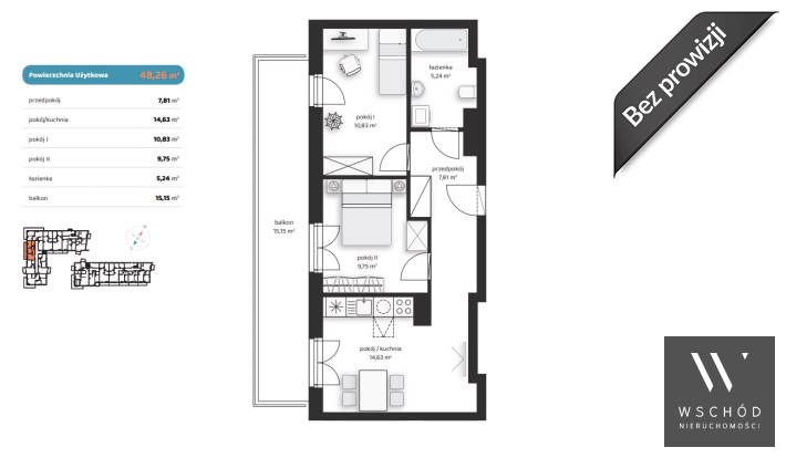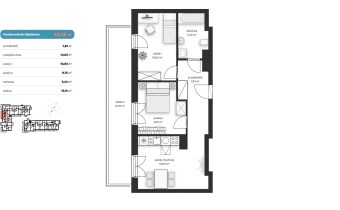 Mieszkanie składające się z salonu z aneksem kuchennym, dwóch sypialni, przedpokoju, łazienki oraz balkonu o pow. 15m2